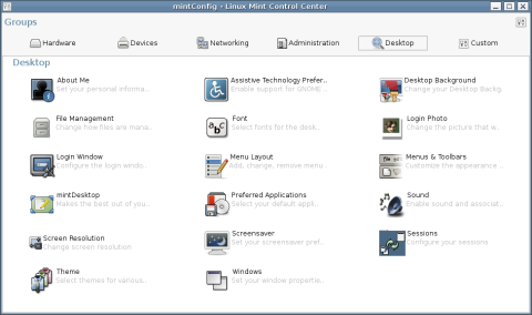 - mintConfig: Este me gusto, es una reorganización a los elementos de los menús de Administración y Preferencias, es bastante parecido al Gnome Control Center, aunque con menor funcionalidad (por ahora), agrupando elementos similares bajo una misma categoría.